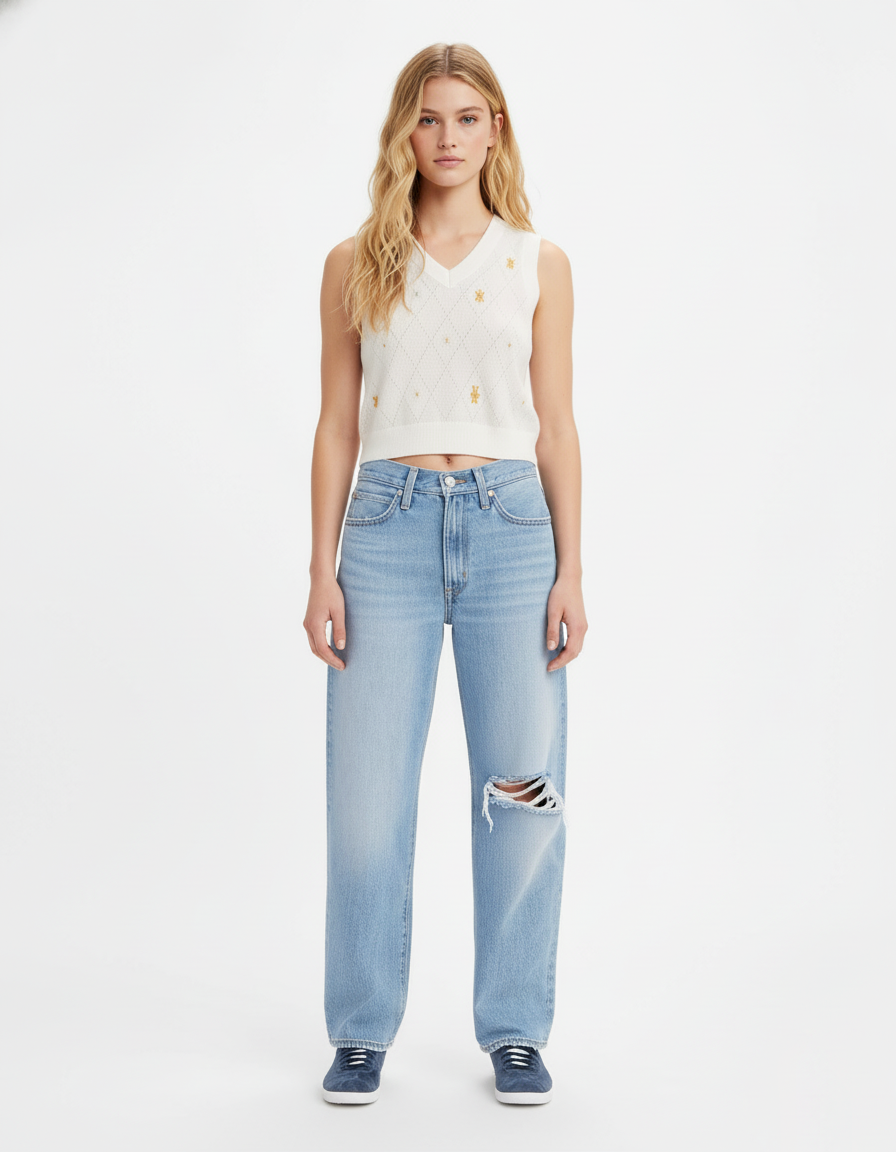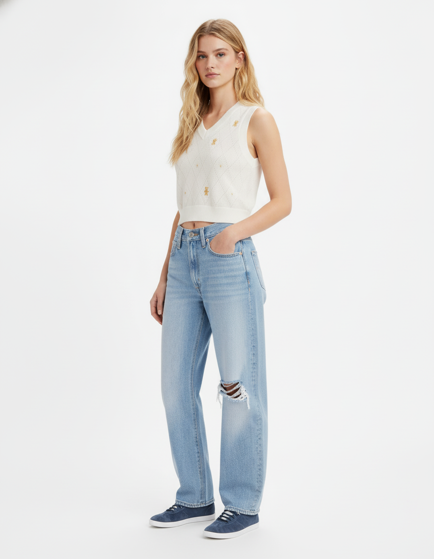 El jean Levi's 94 Baggy para mujer en azul claro tiene un diseño de tiro alto y un ajuste holgado en las piernas, ofreciendo un estilo relajado y cómodo. Su corte de pierna ancha y su acabado en azul claro le dan un toque vintage y casual. Está confeccionado en denim resistente, ideal para un look urbano y desenfadado.