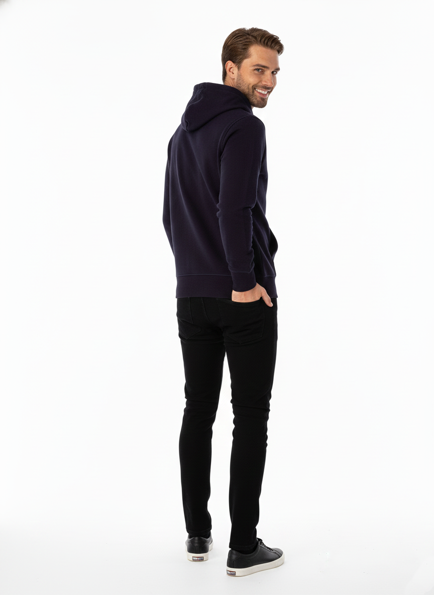 Este suéter con capucha de alta calidad de Tommy Hilfiger en azul marino es ideal para la temporada de invierno o para días fríos. Mantente abrigado y a la moda con esta prenda casual y elegante.